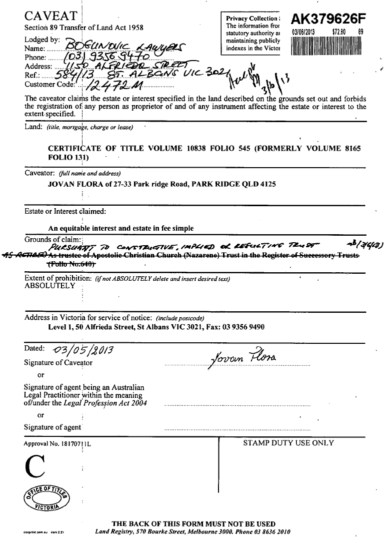 you can see the copy of the caveat lodged by "Bogunovic Lawyers" over